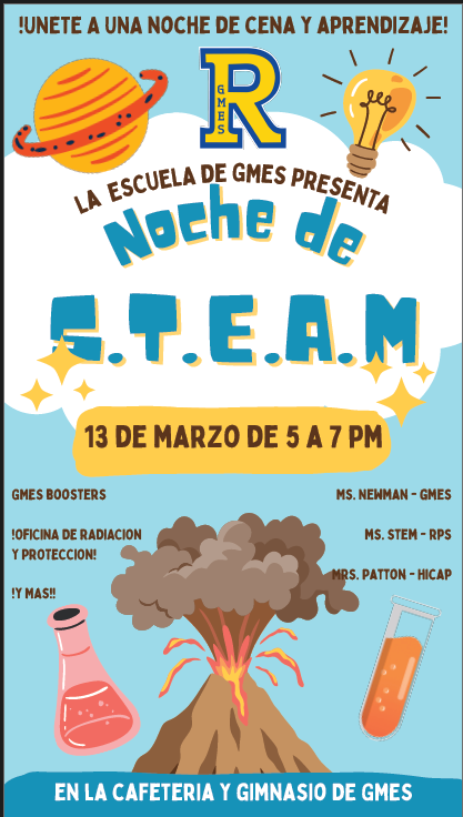 Dear GMES Families, I hope you are able to attend our Science, Technology, Engineering, Art, and Math (STEAM) Night on Friday, March 13th from 5:00PM-7:00PM. We will have about 8 different activities to choose from in the Gym and pizza in the Cafeteria! Sincerely, Dan Aragon |