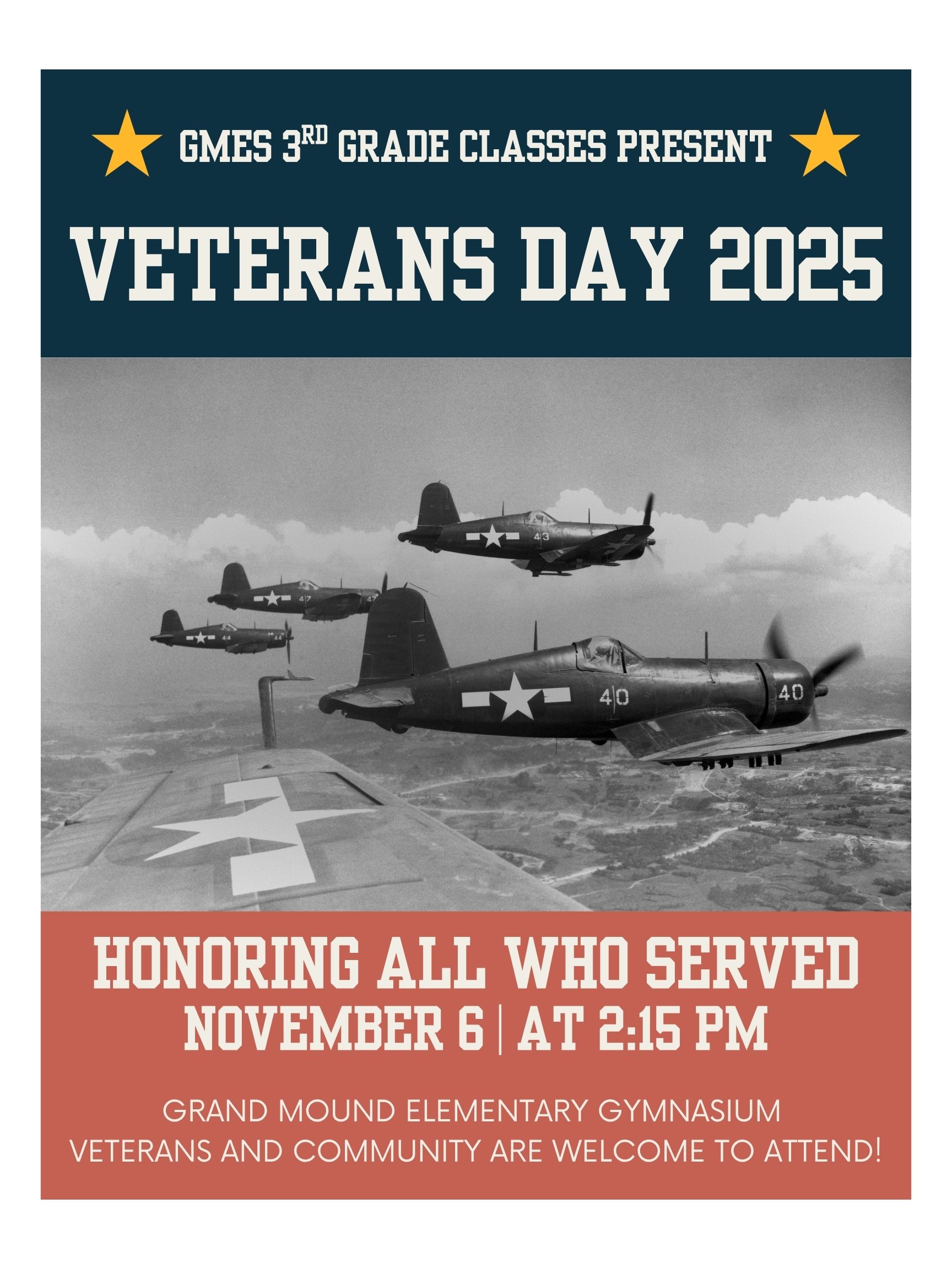 Don't forget to send Christina Bailey a photo of your veteran to be honored in our 3rd grade Veterans Day Performance! Photo, Branch, and relation to GMES student sent to Christina Bailey via Rooms or email cbailey@rochester.wednet |